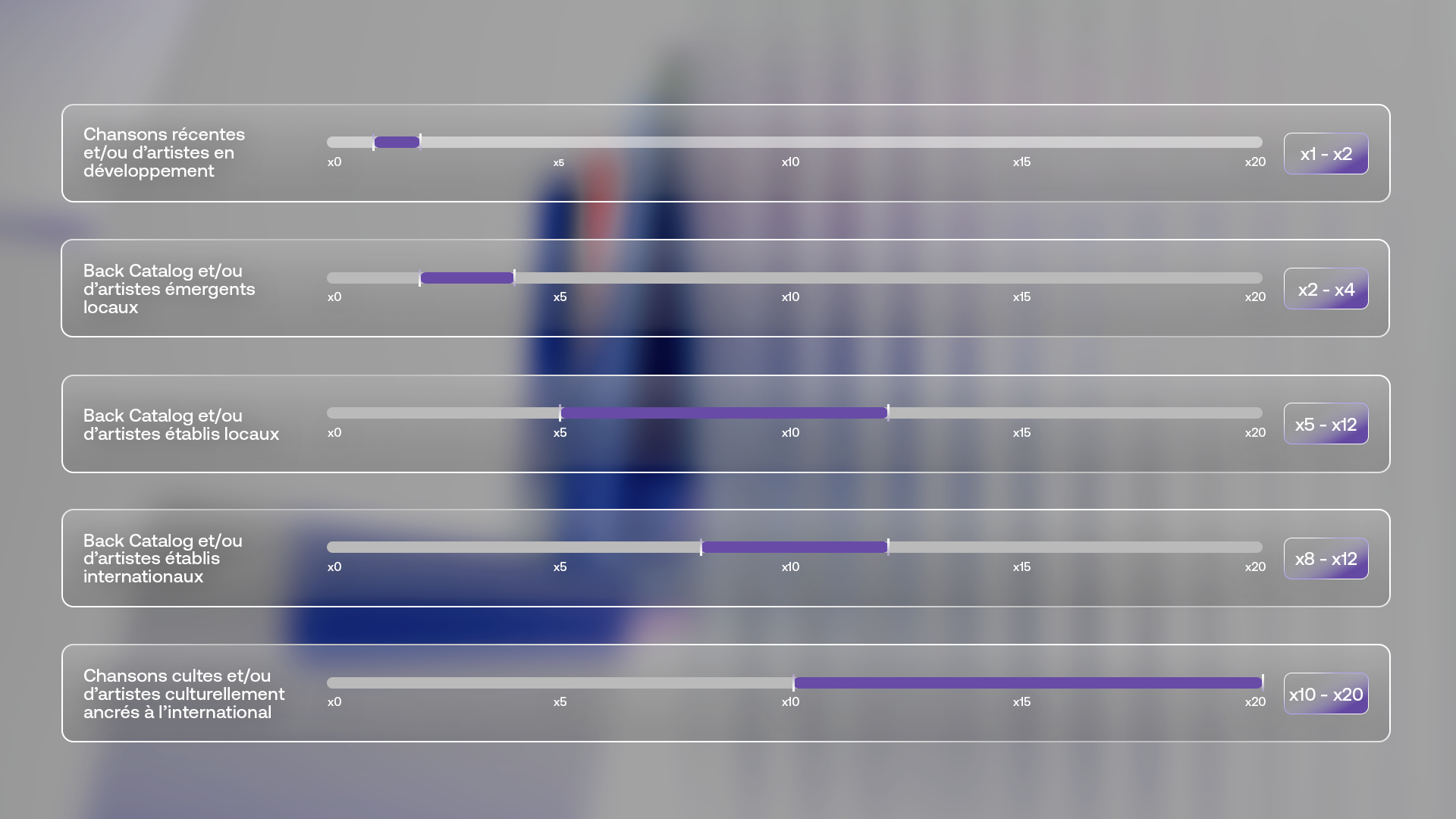 - Artistes en développement ou titres récents : 1x – 2x